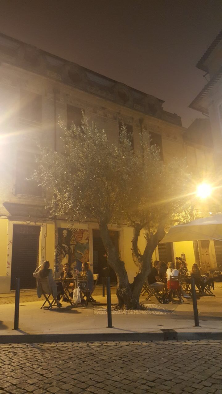 Nur ein paar Straßen weiter in der Rua das Oliveiras befindet sich an einer Straßengabelung eine tolle kleine Bar, die auch spät Abends noch Wein ausschenkt, Flaschen und Gläser dürfen, auch wenn schon alle Tische draußen besetzt sind, mit raus genommen und einfach auf der Straße getrunken werden und das alles unter einem knorrigen Olivenbaum im Schein von alten Straßenlaternen.